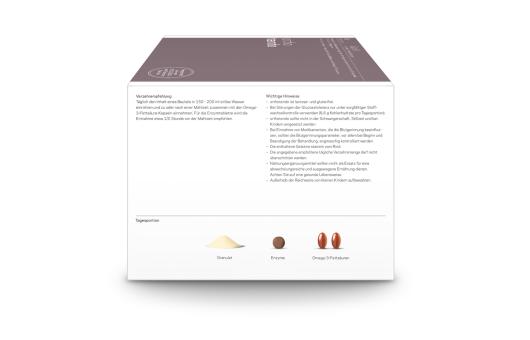 Täglich den Inhalt eines Beutels in 150 – 200 ml stilles Wasser einrühren und zu oder nach einer Mahlzeit zusammen mit den Omega-3-Fettsäure-Kapseln einnehmen. Für die Enzymtablette wird die Einnahme etwa eine 1/2 Stunde vor der Mahlzeit empfohlen.
