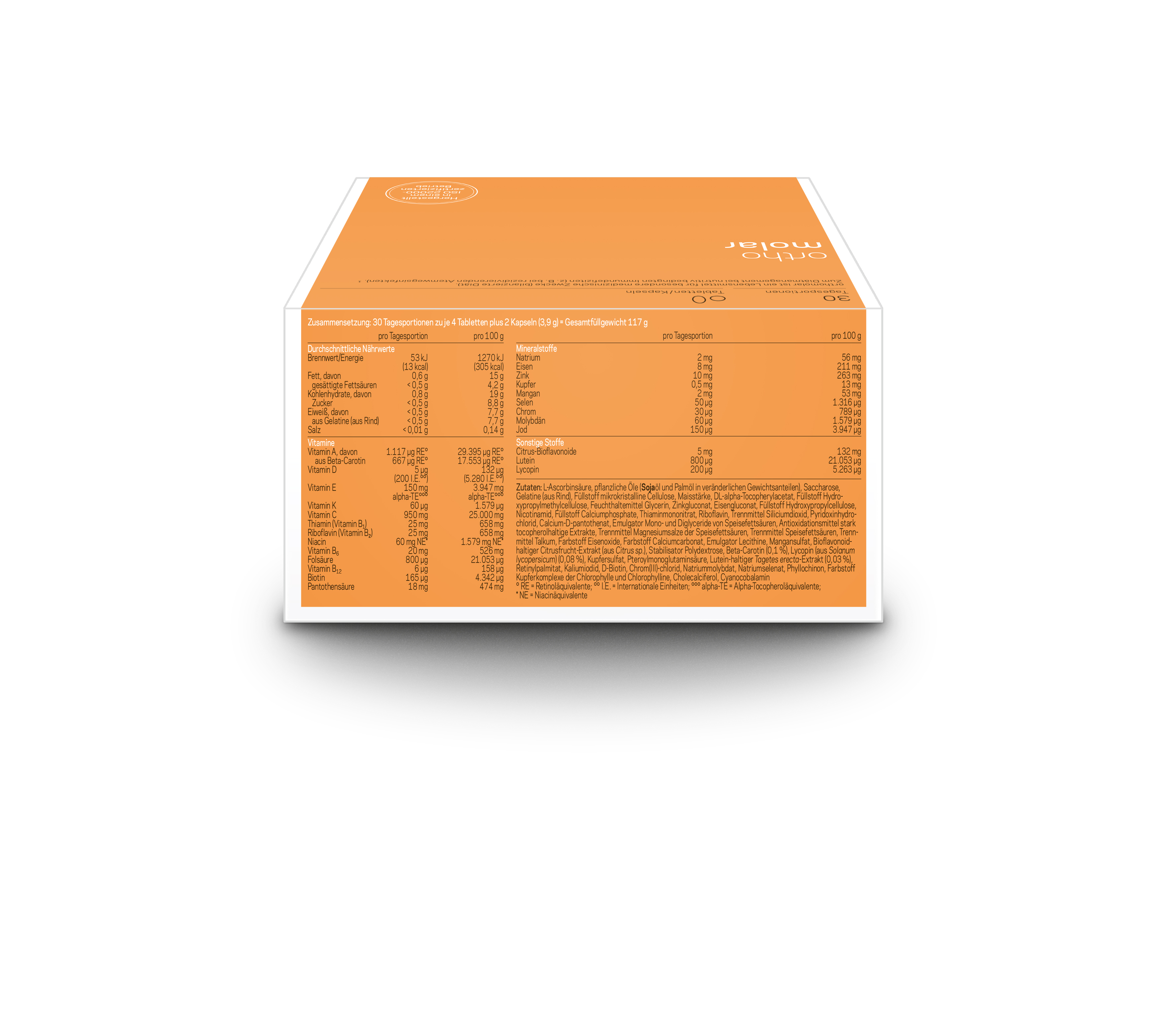 Orthomolar care ist ein Nahrungsergänzungsmittel mit Sekundäre Pflanzenstoffen, Omega-3-Fettsäuren, Vitaminen und Spurenelementen.