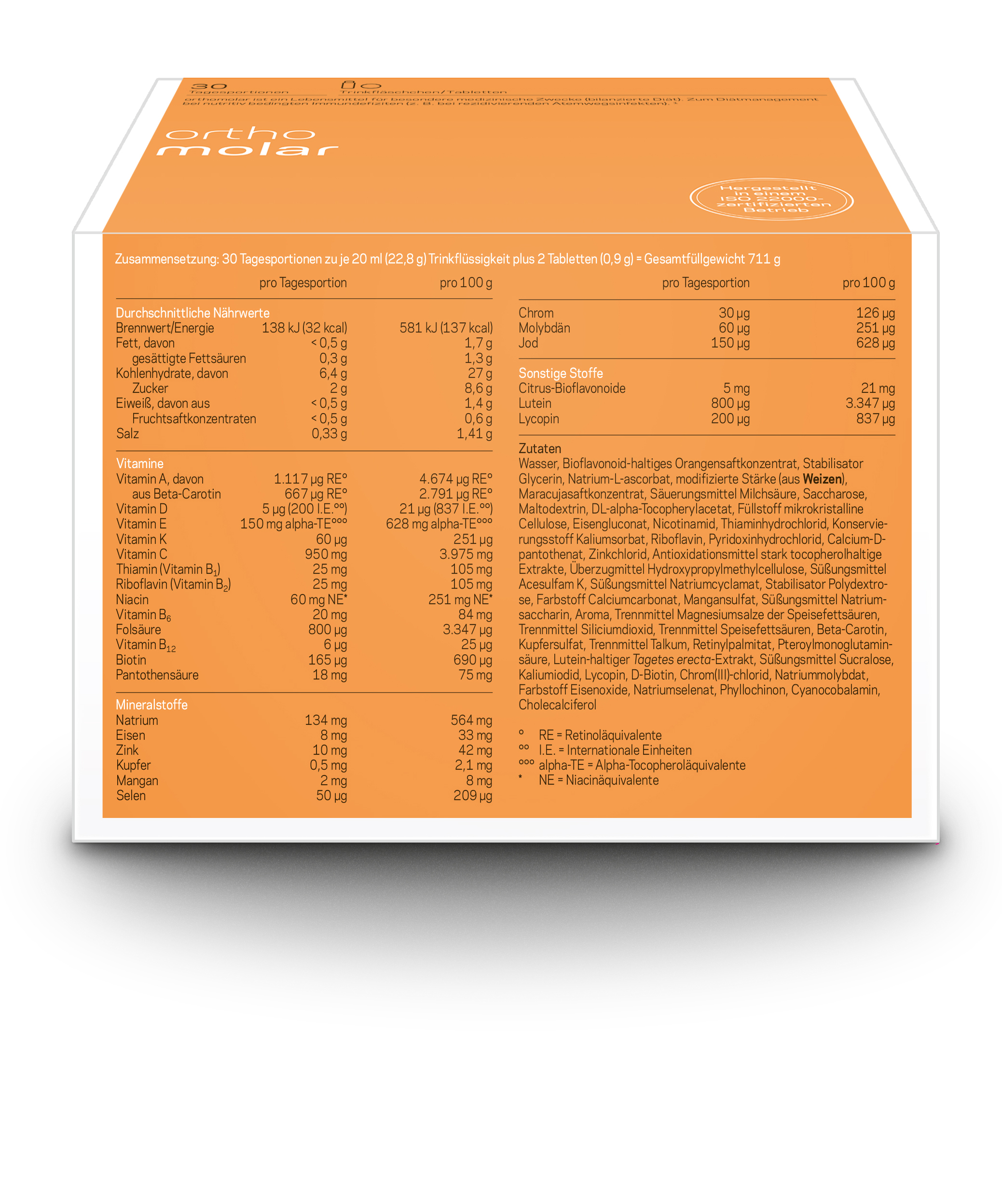 - Orthomolar in der Darreichungsform Trinkfläschchen/Tabletten ist gemäß der Durchführungsverordnung (EU) Nr. 828/2014 glutenfrei. Es ist außerdem lactosefrei.